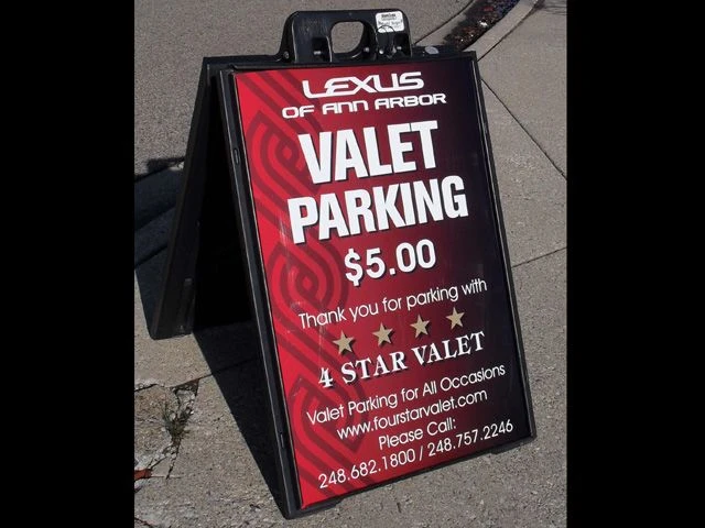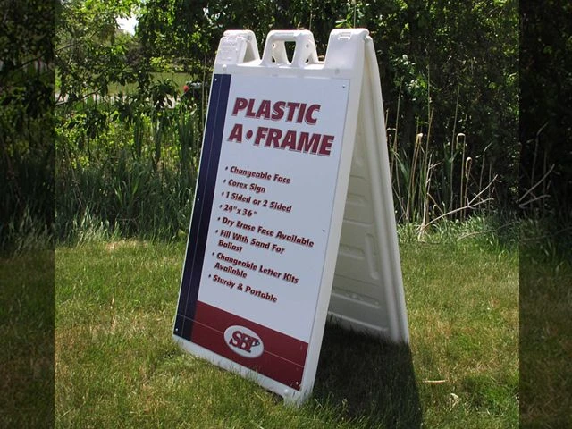 - Plastic A-frame sidewalk signs. You’ll often see these sidewalk signage options from Signs By Tomorrow Ann Arbor in use at parking garages and by valet services, among many other users. Rugged and lightweight, they set-up quickly. Many feature built-in handles for easy carrying when in a folded-up, closed position. Like our metal alternatives, our A-frame plastic sidewalk signs come in many types. For example, in applications where strong winds are common, choose our spring-loaded flat-based A-frames. They have hollow bases you can fill with water or sand to enhance stability.